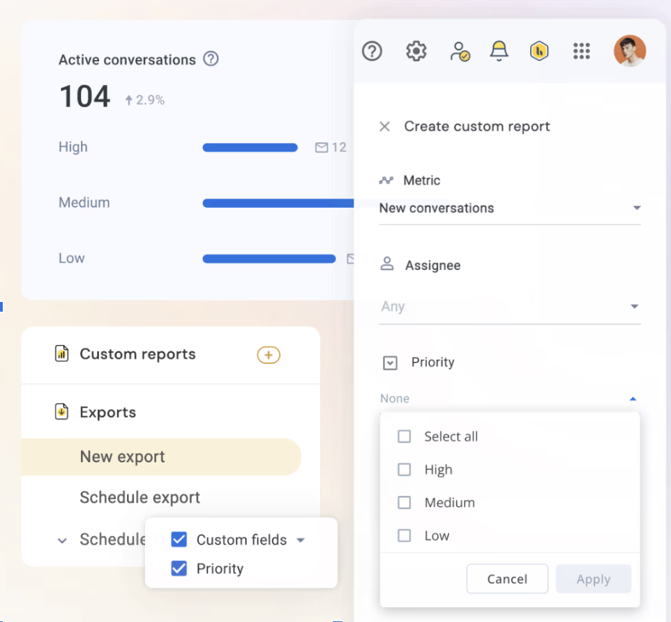 - Custom reports: Admins can build personalized reporting dashboards to track key performance metrics across inboxes. For example, you can create a custom report to track resolution time for all emails that are tagged as “priority”.