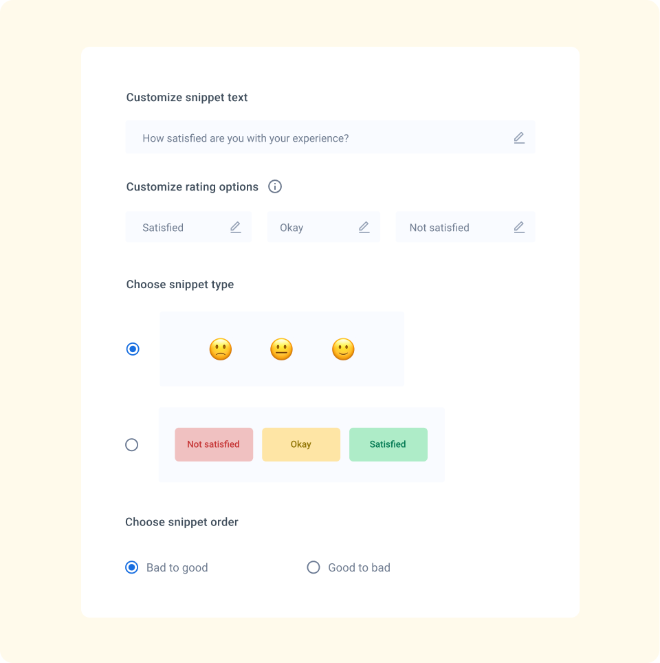 Customize your surveys with forms to collect quantitative and qualitative feedback. Personalize your feedback question and response options to boost your response rates.